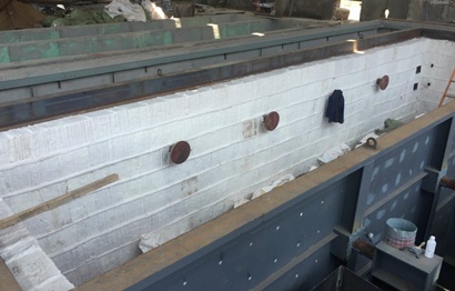 鋅鍋蓋板頂部保溫,為防止火道內風(fēng)速將陶瓷纖維材料吹散堵塞火眼,所以在頂部采用陶瓷纖維板做保溫,一般采用兩層50mm厚陶瓷纖維板錯縫拼接。